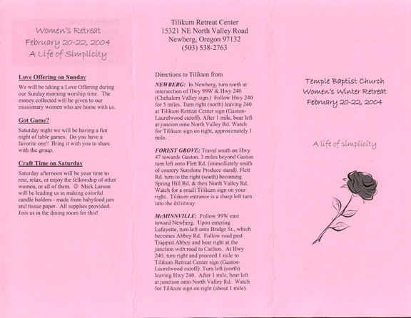 The Ladies of Temple invite you to join them next year, in February 18-20, 2005, for the next Women's Retreat. Please call 503-233-5953 for details.