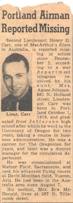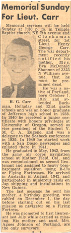 A memorial service for Lt. Henry George Carr, a member of our church since 1936, was held Sunday evening, February 10th. Lt. Henry Carr was a navigator on a Flying Fortress (B-17) which failed to return from a bombing mission over New Guinea, on December 2, 1942.