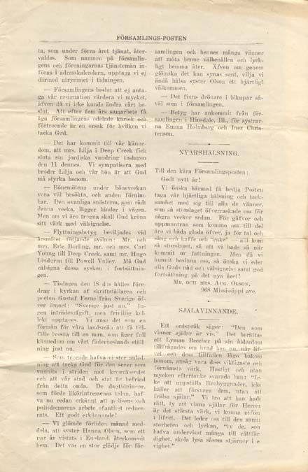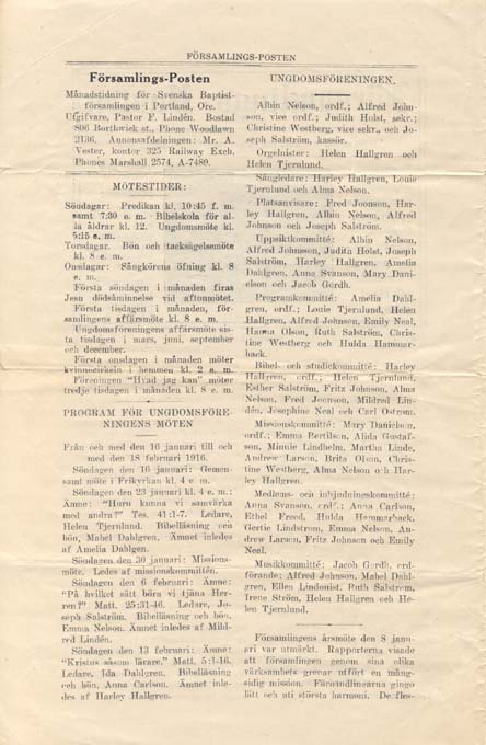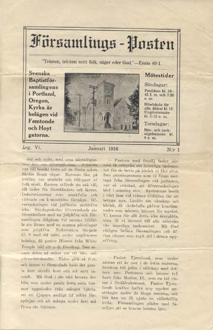 This news letter was furnished by Betty Hallgren. It was published January, 1916, for our church which was then located on 15th and Hoyt.