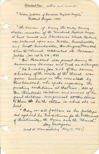 The following document is from Notes compiled by Harley Hallgren and written by Amy Gustafson. (read at a Palmblad Clan meeting August 19, 1934.)