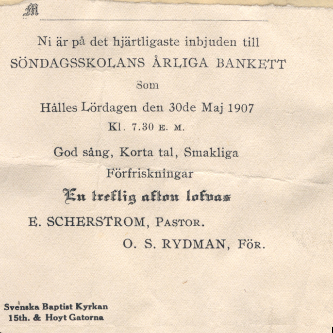 You are most welcome to the Yearly Banquet of the Sunday School which is held on Saturday, May 30th 1907.